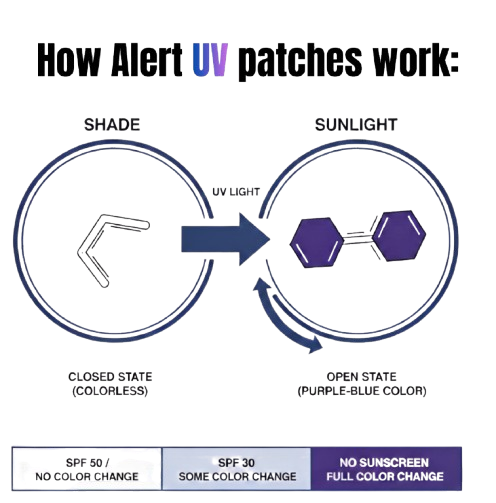 Our patches act as a second skin; you apply one, cover it with suncream, and head out. As the cream washes away or breaks down, the patch reacts to the sun, turning purple to give you a clear, visual alert that it’s time to reapply.